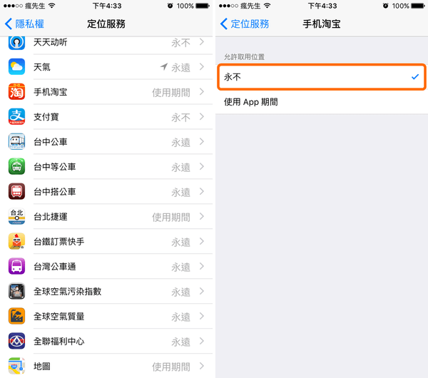 有些APP根本就不需要定位,且定位也沒有任何補助效果,像是音樂、支付寶、露天、PCHOME等這類APP都可以將定位功能關閉,可到「設定」>「隱私權」>「定位服務」,選擇要關閉定位服務的APP,將它們改成「永不」。