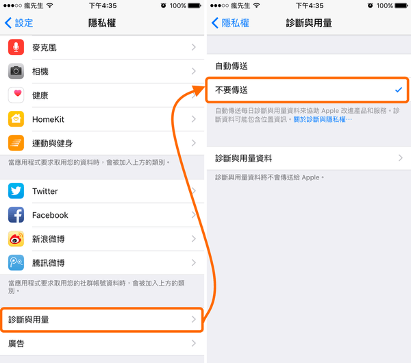 為了協助Apple可改進產品與服務,默認會將每日診斷與用量資料自動開啟並定時回傳這些資料至蘋果伺服器上,如想要降低耗電可到「設定」>「隱私權」>「診斷與用量」內改成「不要傳送」即可。