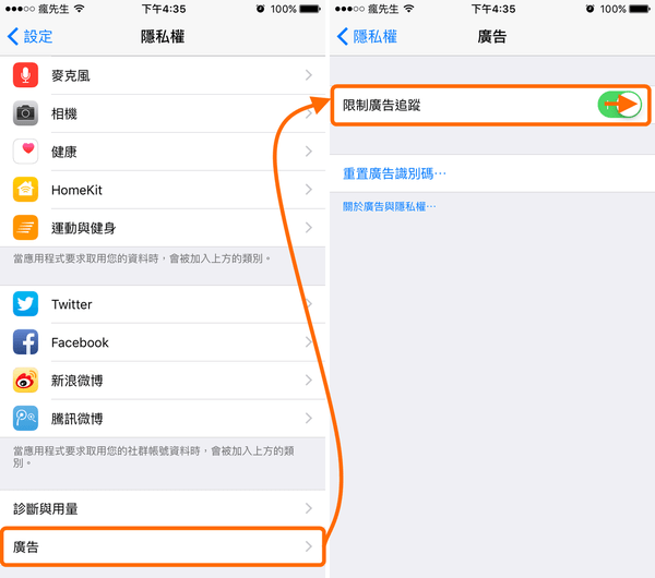 - 「設定」>「隱私權」>「廣告」,開啟「限制廣告追蹤」