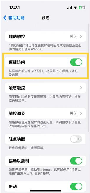 3、打开【便捷访问】右侧的开关,然后从屏幕底部边缘向下轻扫即可触发单手模式。
