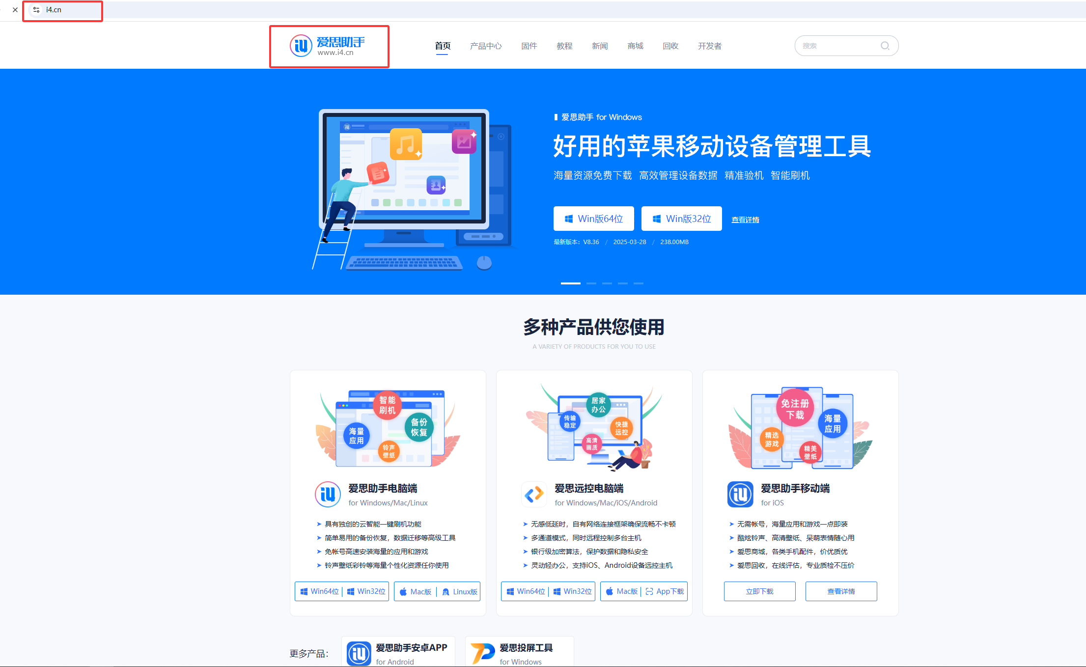 1、浏览器输入 www.i4.cn 进入爱思助手官网下载爱思助手电脑客户端,安装完成后点击右下角“检查更新”更新至V8.36最新版。