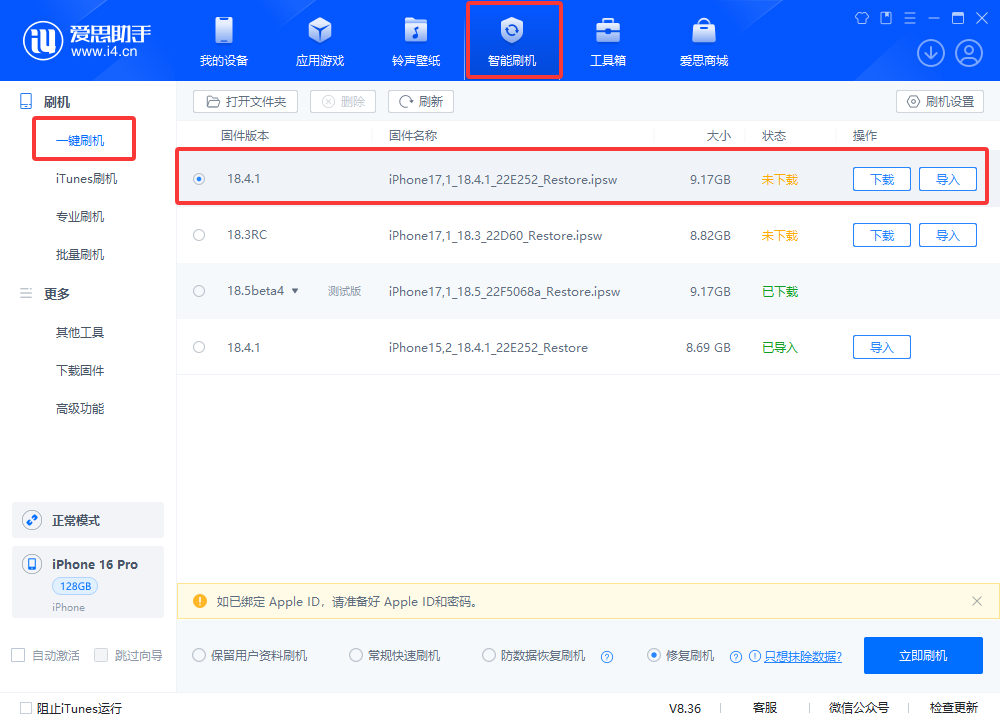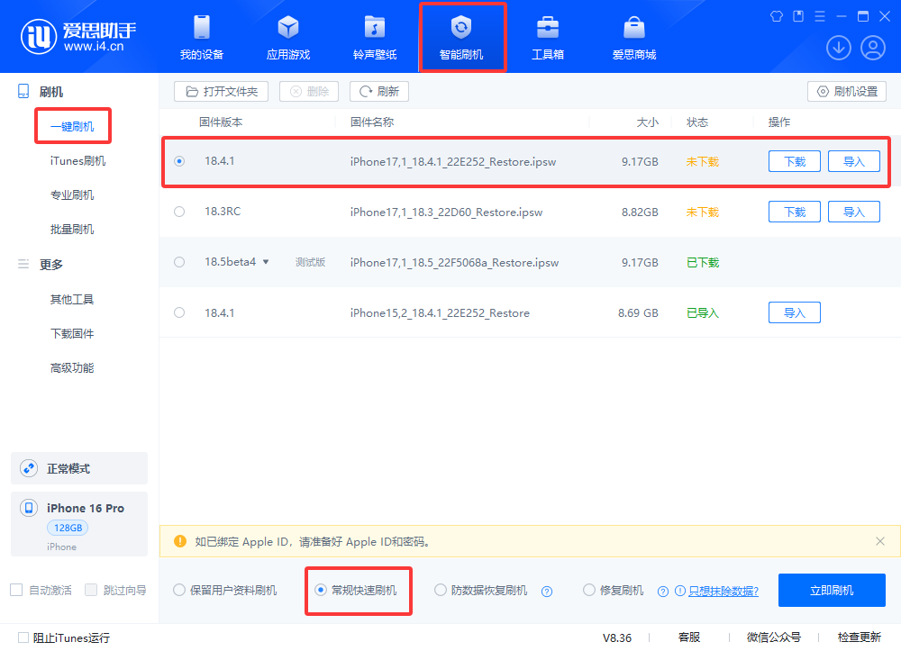 4、在可刷固件版本中选择您要刷的 iOS 版本,随后勾选“常规快速刷机”点“立即刷机”,爱思助手会自动帮您下载固件并开始刷机,如果您已下载固件可以点击“导入”,再点“立即刷机”;