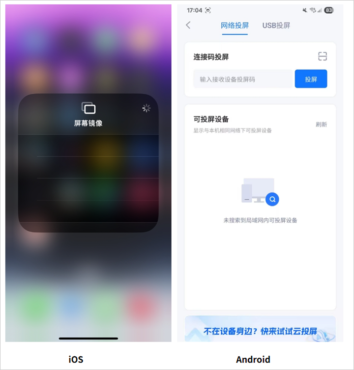 1、使用网络投屏的时候,会自动搜索当前网络局域网内可投屏设备