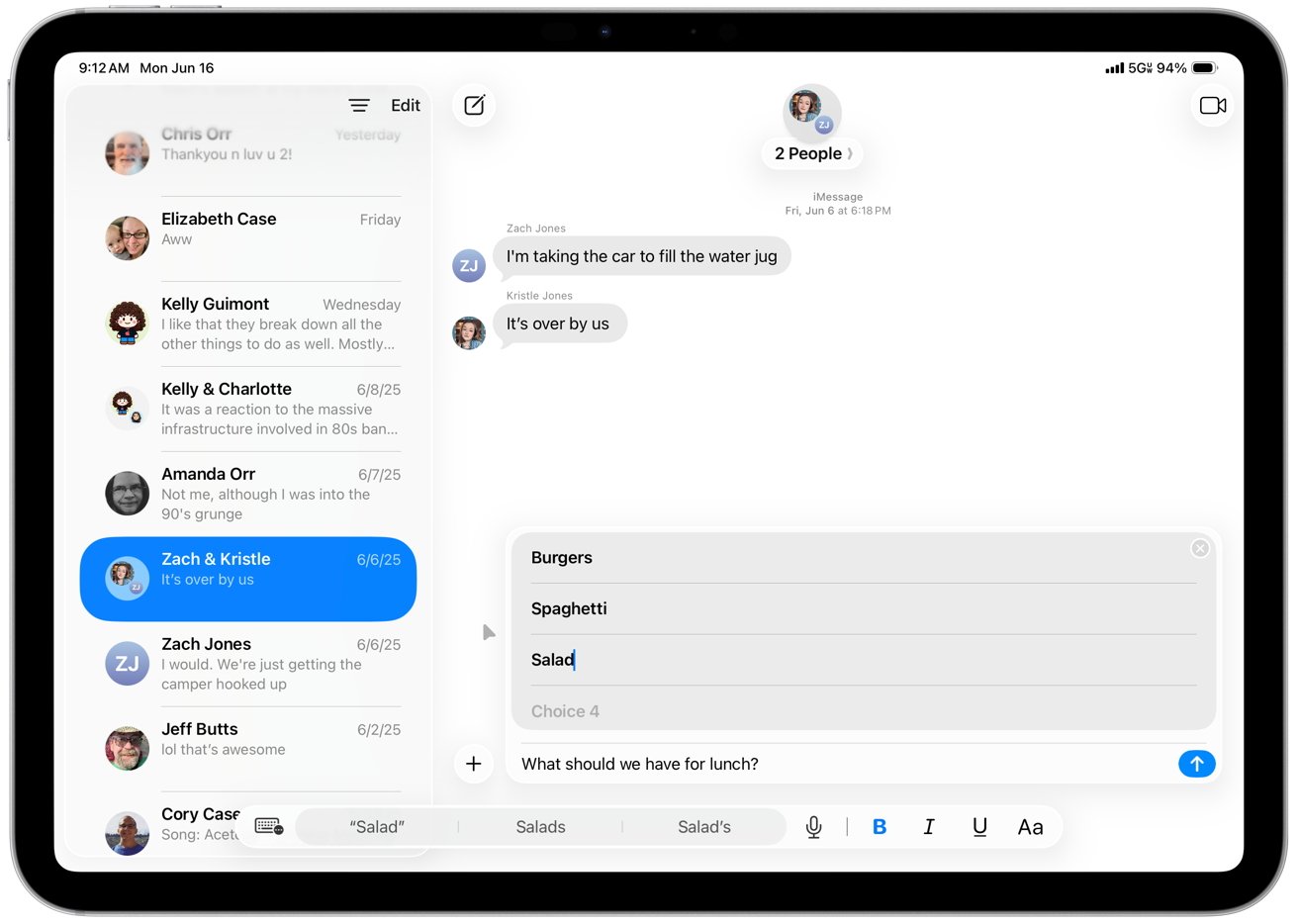 Apple is also giving polls a boost with its on-device AI system Apple Intelligence. When the system detects planning-related questions, it can suggest creating a poll.