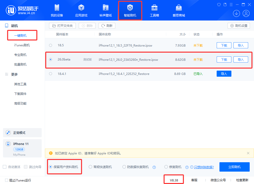 升级系统刷机分为“升级”和“平刷”,升级简单易懂,如 iOS 18.5 升级 iOS 26 。“平刷”是指当前版本内的升降级。例如:iOS 18.5正式版(或RC版),想降级到iOS 18.5beta版,iOS 18.5beta版升级到iOS 18.5beta4版(RC版),都视为版本平刷,系统升级和平刷都是可以“保留用户资料刷机”的。升级前请提前做好备份,避免数据丢失/方便恢复数据。