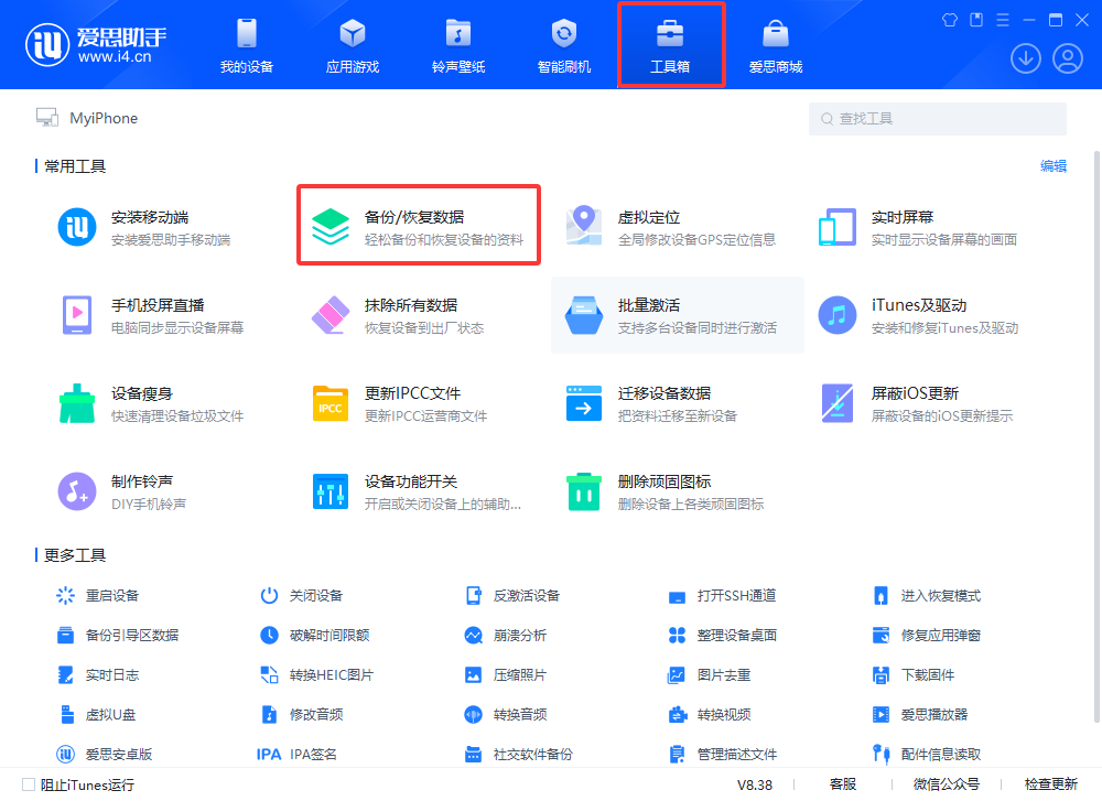 一、点开“工具箱”选择“备份/恢复数据”,根据需求选择全备份或分类备份,避免数据丢失。