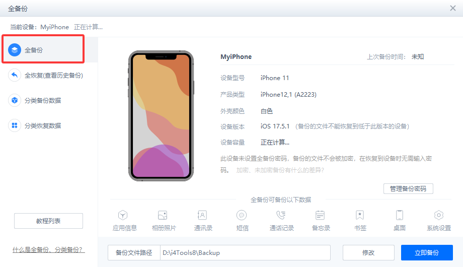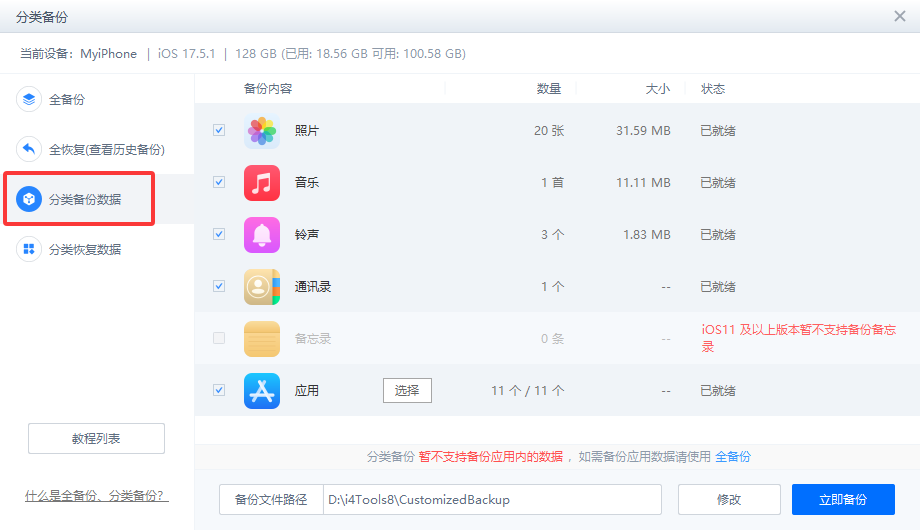 三、如未做过全备份,需降级系统,选择分类备份,备份照片/视频、通讯录,重要资料和聊天记录需单独导出在桌面进行数据备份/恢复。