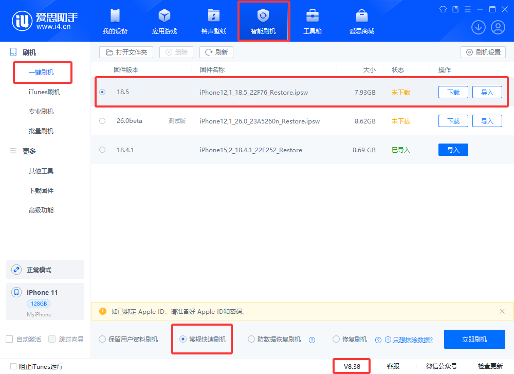当前 iOS 高版本想降级到 iOS 低版本时,可以通过爱思助手刷机来解决,但只能降级到苹果公司开放验证通道的版本。例如:iOS 16、iOS 17、iOS 18-iOS 18.4 系统都是苹果已经关闭验证通道无法降级的版本,所以降级刷机只能选择当前开放验证的版本,如 iOS 18.5 正式版。
