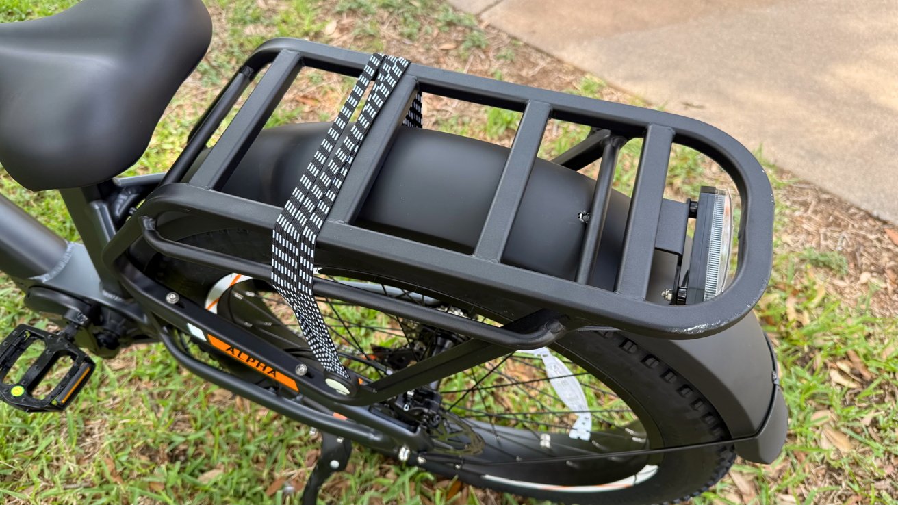 The built-in rack has a solid construction that holds up for quite heavy payloads. The included bungee worked pretty well for strap-down, and the orientation of the frame of the rack is good for adding more.