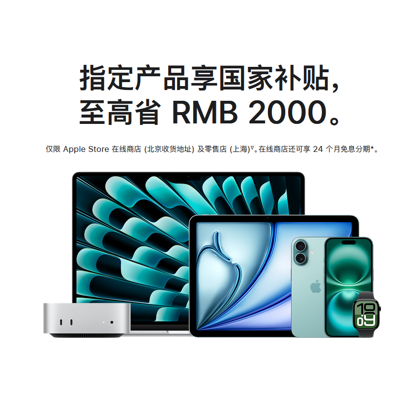 覆盖MacBook Air/Pro、iMac、Mac mini和Mac Studio全系产品,但升级配置的机型无法享受补贴。