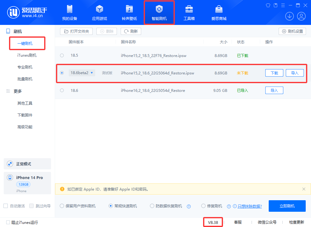 ※4、设备升级到 iOS 18.6 beta2版后,想降级到其它“苹果未关闭验证”版本,不建议勾选“保留用户资料刷机”,可能会出现刷机失败或刷机成功后设备异常;建议先使用爱思助手分类备份资料后进行全新刷机,成功后再分类恢复资料;