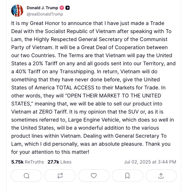 Trump's new deal with Vietnam comes shortly after his signing one with China, which is also bad for Apple, other US businesses, and therefore consumers. There are expected to be more such deals announced in the next few days.