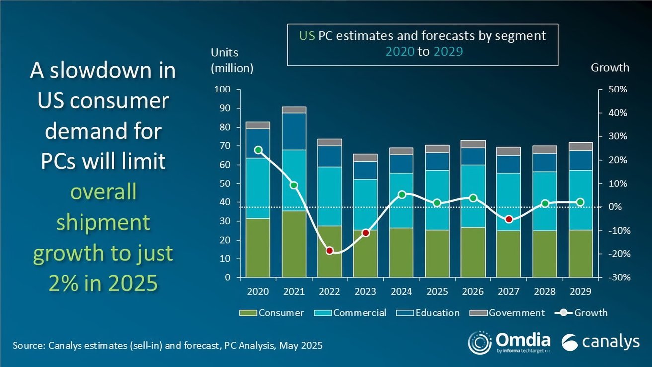 Canalys forecasts just 2% growth in total U.S. PC shipments for all of 2025. This suggests a sharp slowdown in shipments, as you'd expect given the reason for the surge, after Q1.