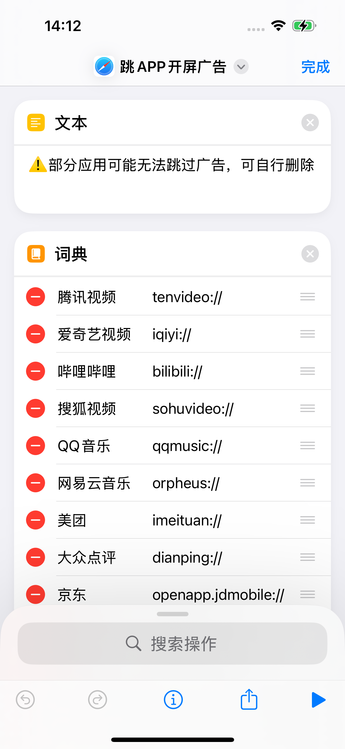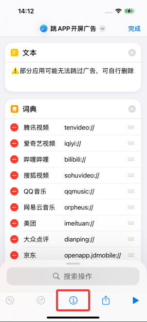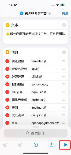 二、打开快捷指令,开启“跳APP开屏广告”选择添加/删除应用(新增应用需要填写对应的链接,如:taobao://)。