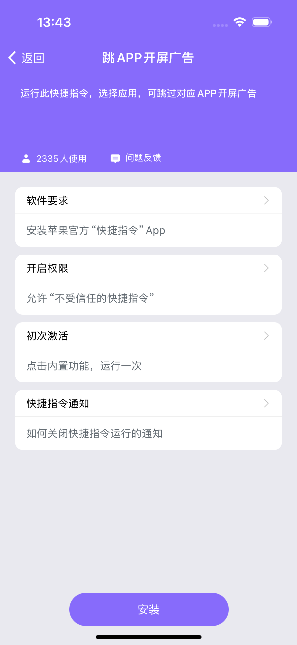 一、打开爱思全能版,点击底部导航“我的”点击“快捷指令”搜索“开屏”安装“跳APP开屏广告”快捷指令。