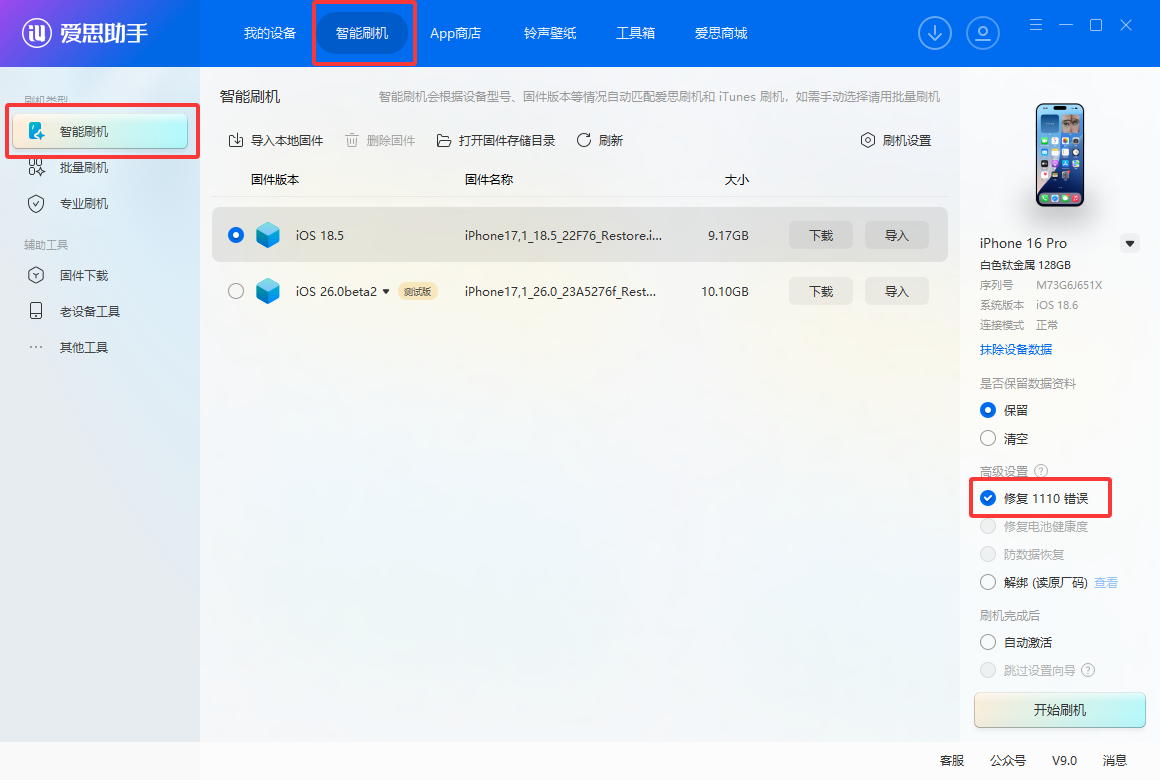 如果是因为储存空间满了,导致 iPhone 无法开机或使用,可以选择“修复1110错误”刷机模式,此刷机模式可以保留用户资料。(设备因硬盘可用空间不足出现的无限白苹果,也可以直接使用以下方法进行操作)