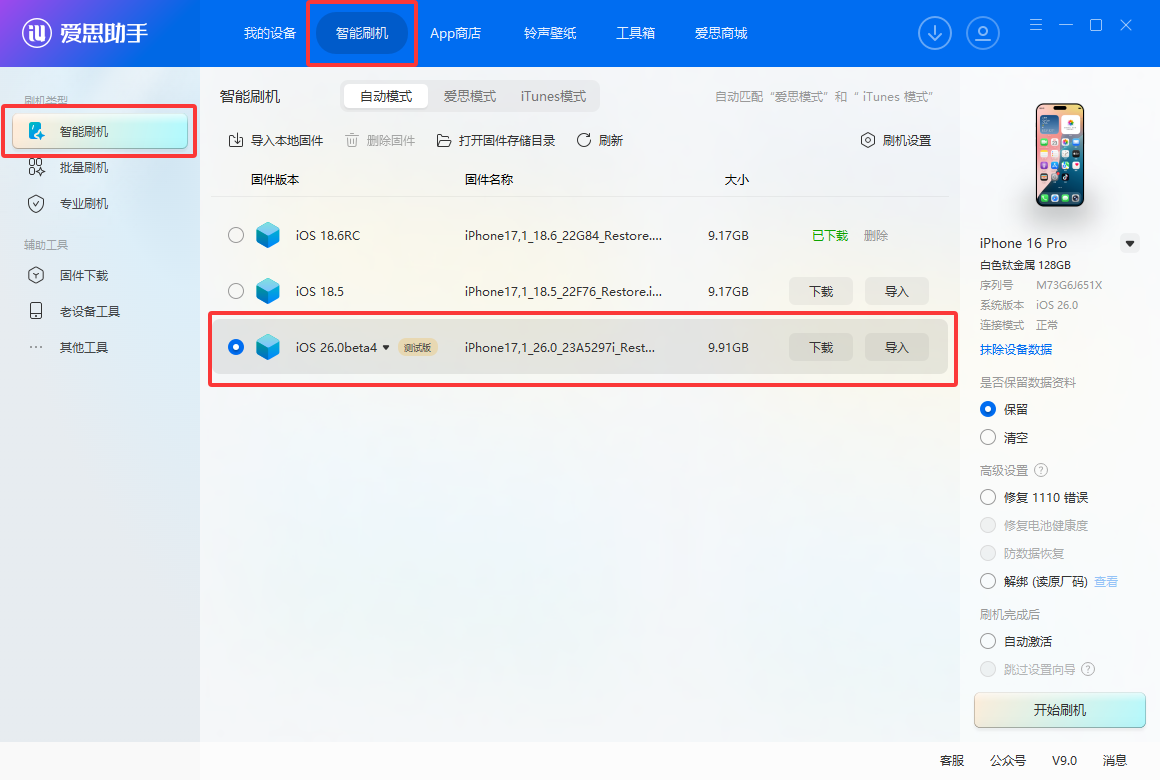※4、设备升级到 iOS 26 beta4版后,想降级到其它“苹果未关闭验证”版本,不建议勾选“保留用户资料刷机”,可能会出现刷机失败或刷机成功后设备异常;建议先使用爱思助手分类备份资料后进行全新刷机,成功后再分类恢复资料;