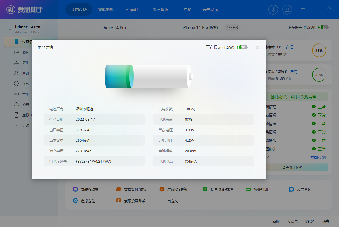 对于苹果用户而言,选购时不妨多一份理性考量:是愿意为了极致轻薄牺牲日常续航,还是更看重全天候使用的踏实感?如果对新款机型仍有期待,不妨等上市后通过爱思助手验机报告检测实际电池性能 ,其验机功能能精准显示电池循环次数、实际容量与设计容量偏差等关键数据,帮你避开 "参数陷阱"。
