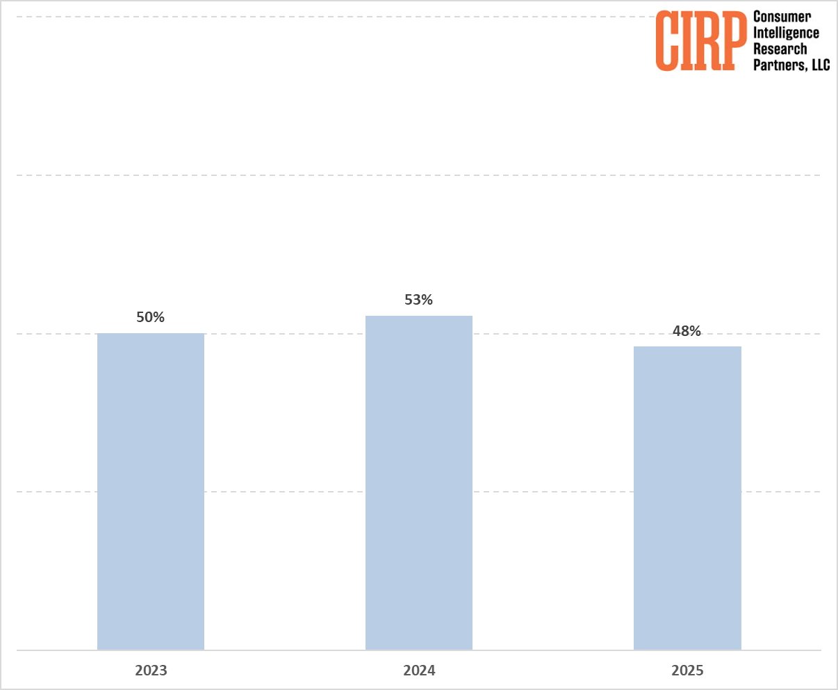 Consumer Intelligence Research Partners (CIRP) reports that 48% of U.S. iPhone buyers upgraded from base storage in the twelve months ending June 2025. CIRP says this is down from 2024, but the past three years' figures aren't drastically different.