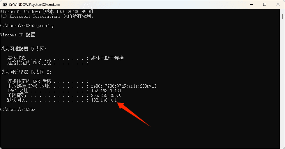(3)在电脑上:Win+R→ 输入cmd→ 执行ipconfig命令,确认以192.168.x.x开头的真实局域网IP