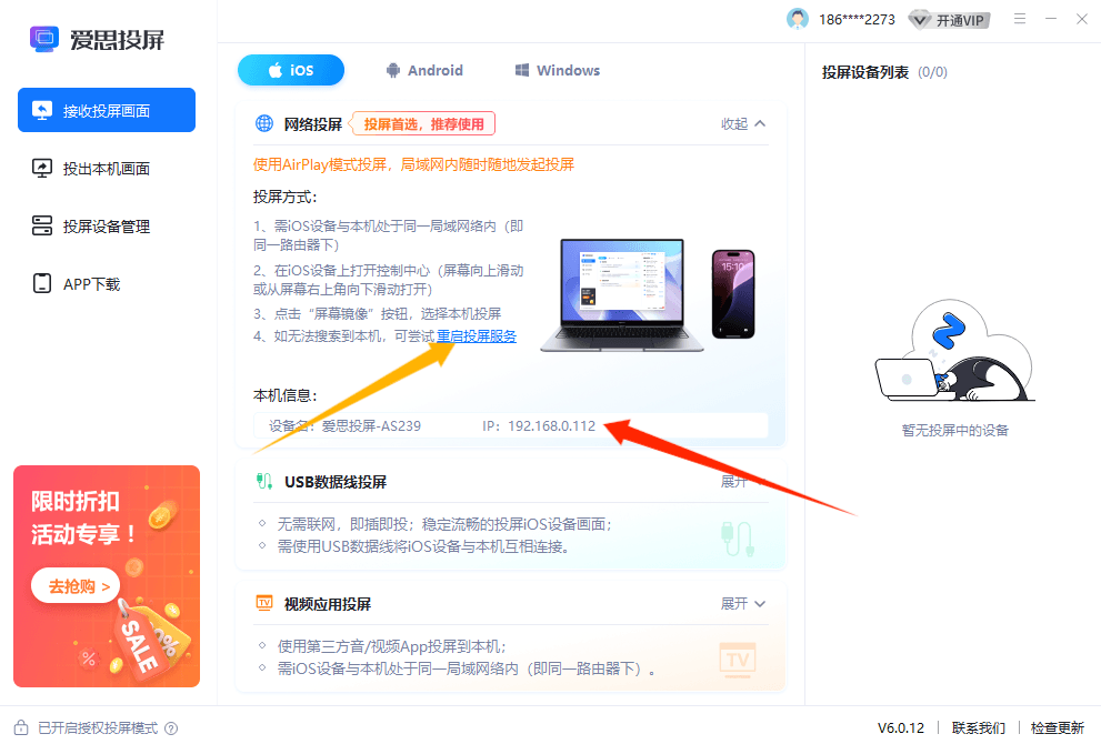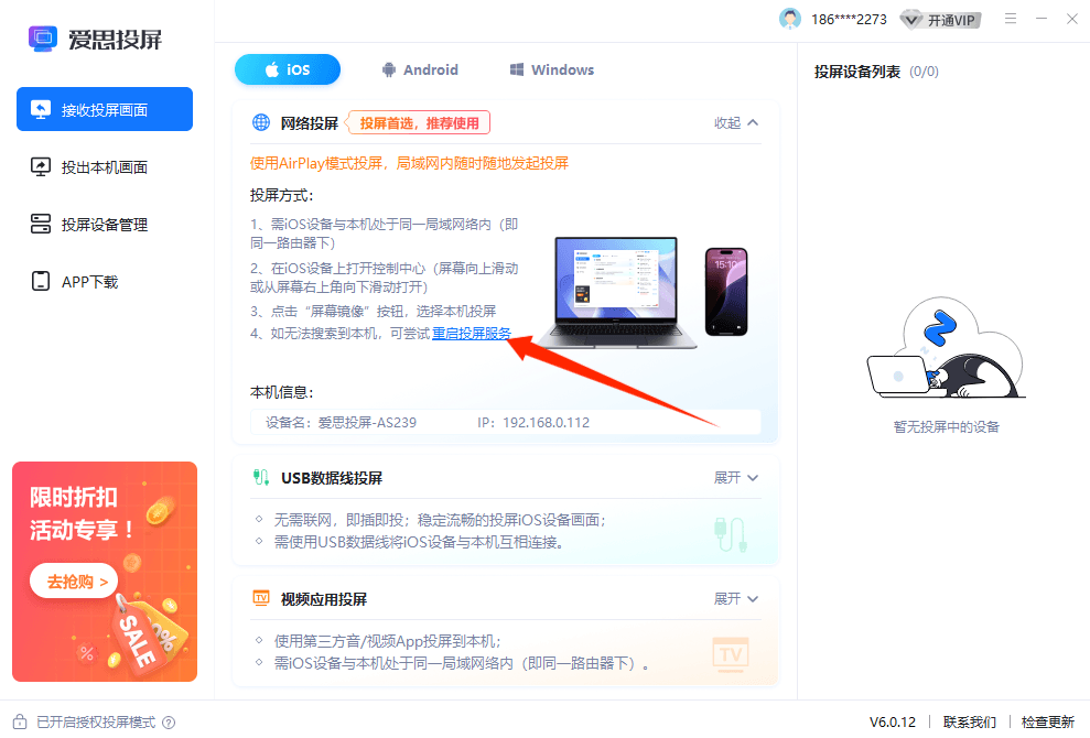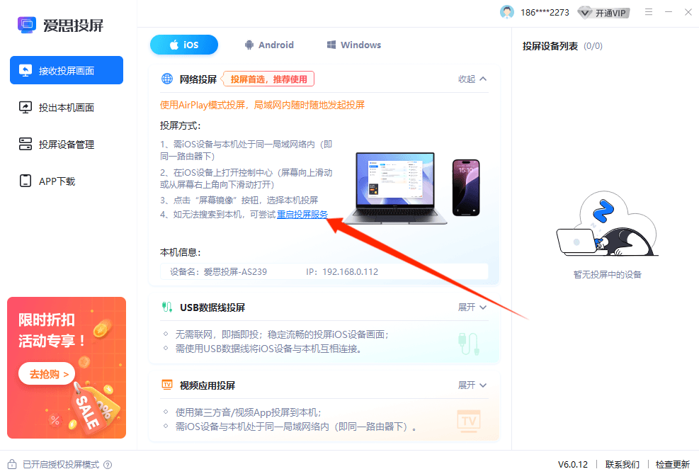 解决方法:请在爱思投屏首页点击“重启投屏服务”,通常可重新扫描并识别AirPlay设备。同时确保电脑和手机处于同一网络段,且无路由器设备隔离设置。