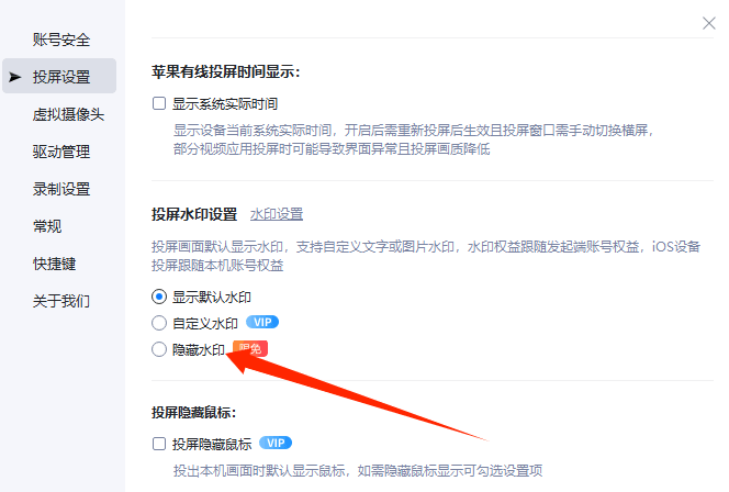 解决方法:在“投屏设置”中找到投屏水印设置,然后再进去勾选隐藏水印就可以了。