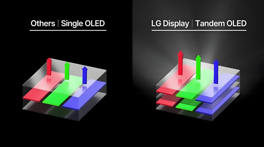 LTPO 技术融合了低温多晶硅(LTPS)和氧化物薄膜晶体管(TFT)的优点,既实现了高速电子迁移率,又降低了漏电流,从而显著优化了功耗表现。而串联 OLED 则通过堆叠两层或更多发光层,在相同亮度下比单层结构更节能,寿命也更长。这类技术最初用于车载显示,后来逐渐扩展至笔记本、平板等需要长时间高亮使用的设备。